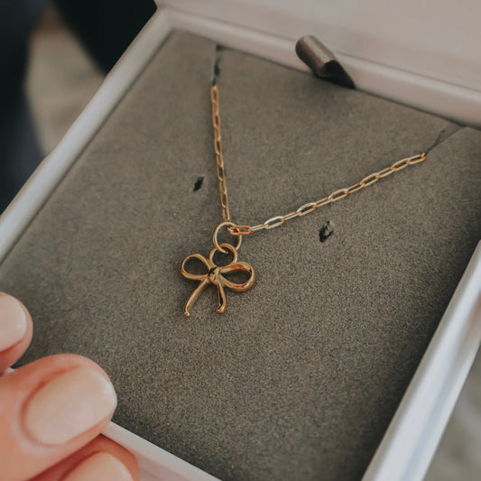 Featuring a beautifully detailed bow charm on a mini paperclip chain, this Katyb Jewellery, piece...