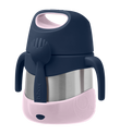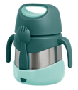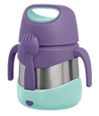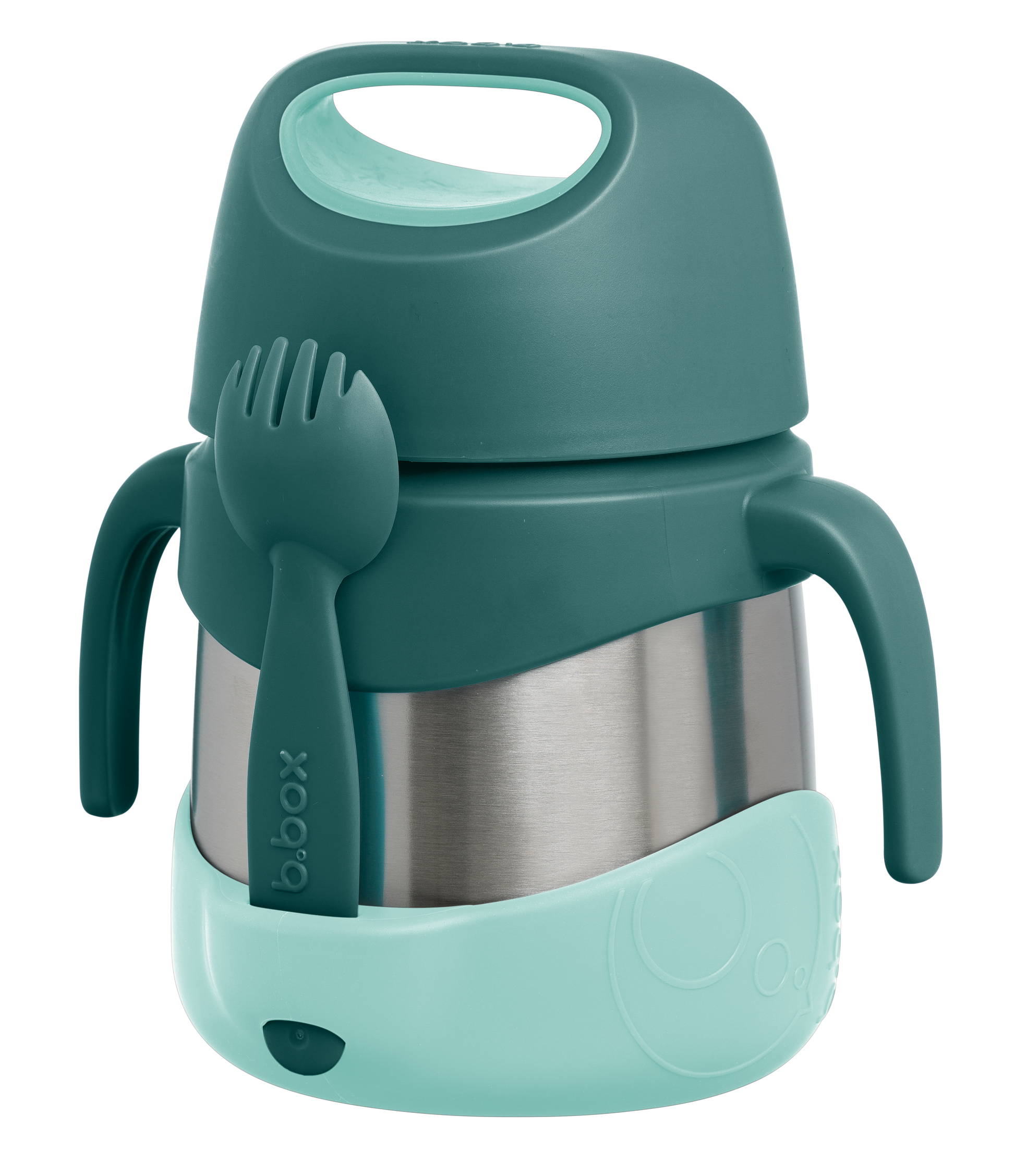 Complete with spork utensil that tucks away into custom bumper, and easy grip handles giving kids leverage to open the jar easily, encouraging independence.