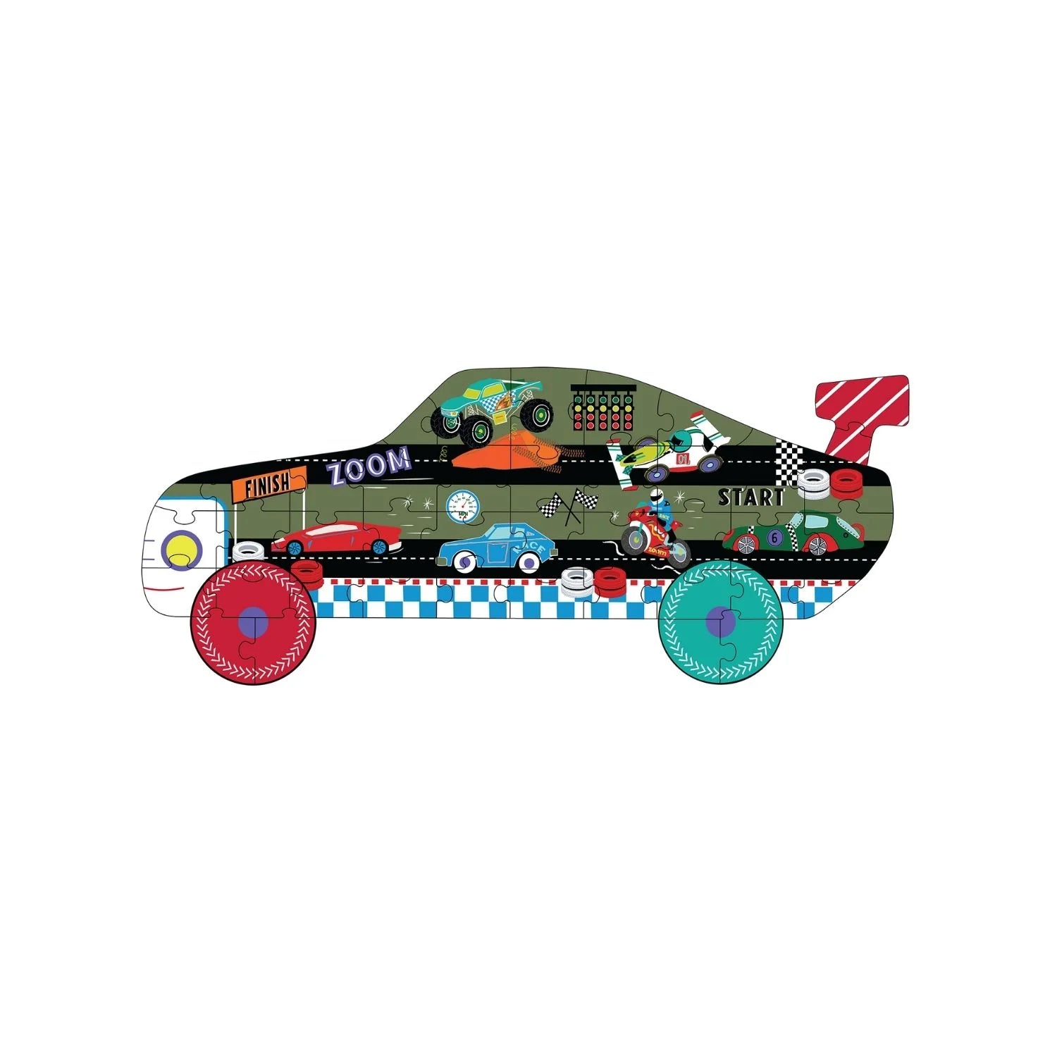 On your marks, get set, GO! Speed into playtime with this cool Cars 40 piece puzzle. Inside the reusable shaped box, there’s 40 fantastic chunky puzzle pieces that build a brilliant car shaped puzzle complete with a race track, finish line, racing cars, motorbikes and a monster truck too!
