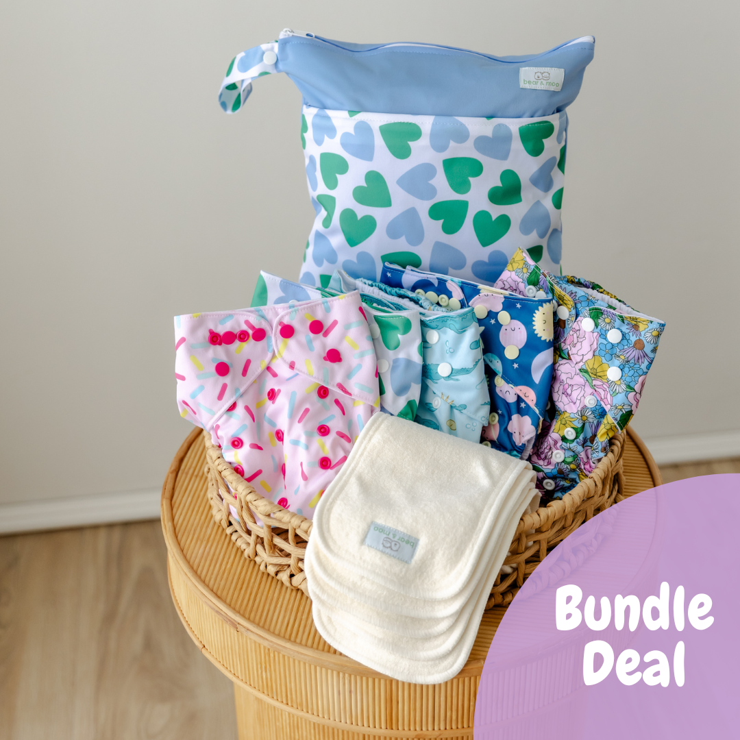 Our custom Let's Get Started Bundle makes starting your cloth nappy journey super easy! If you haven't already, be sure to read our Getting Started with Cloth Nappies article to help you understand all things cloth.