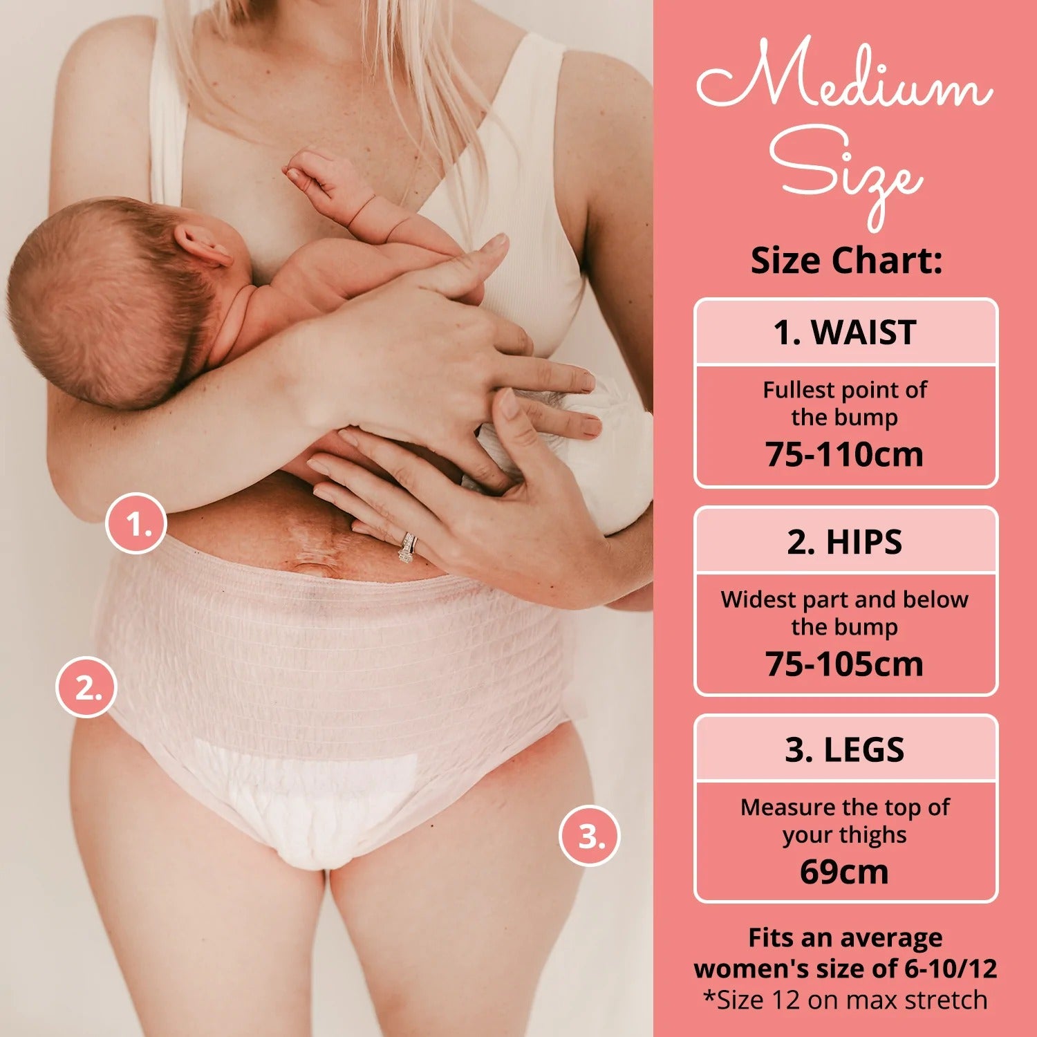 Partum Panties' in Medium is suited to an average women's size of 6-10/12 and a waist 75-110cm. (If you are normally a size 12 pre-pregnant, then go up to next size for comfort.)