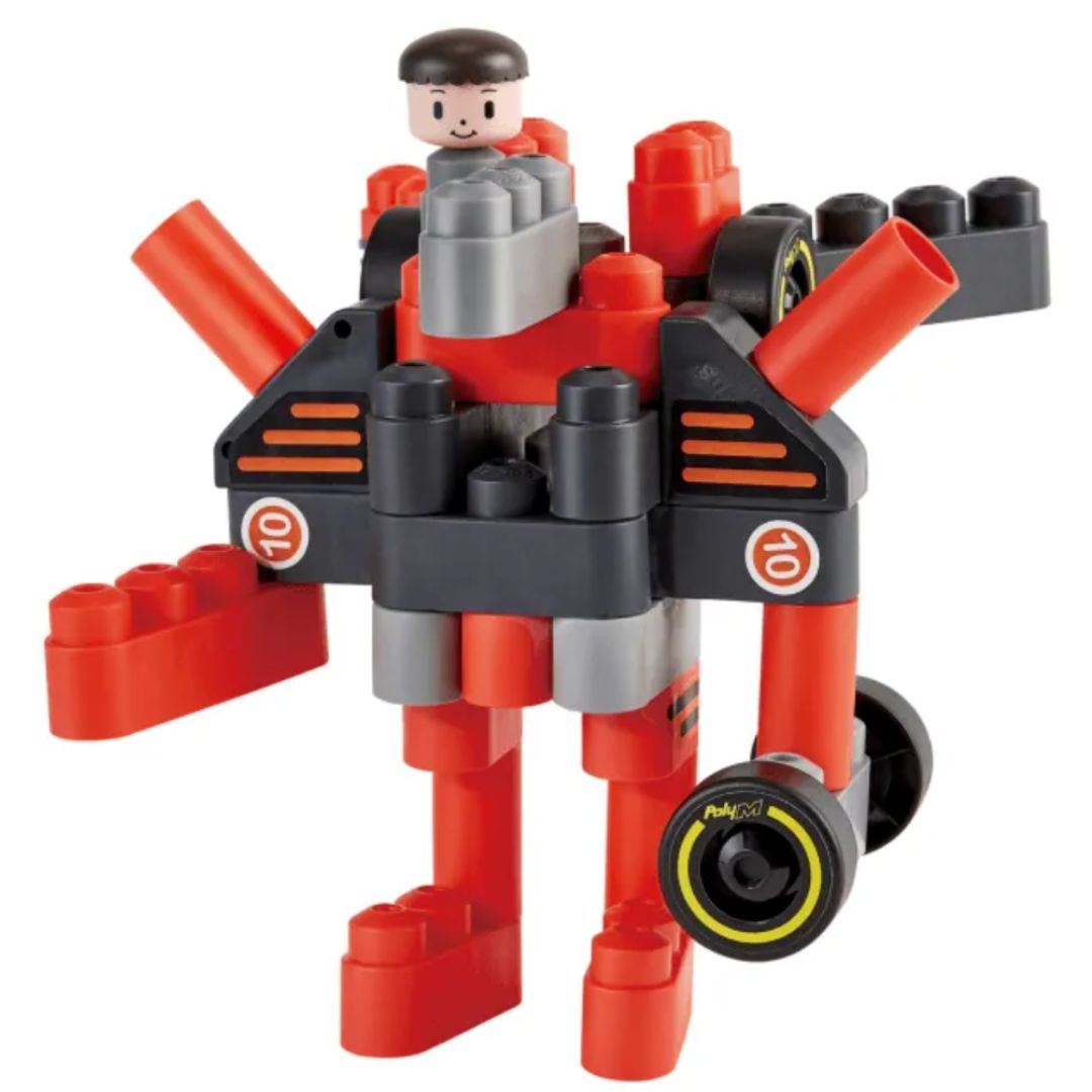 The PolyM Racing Car set includes 31Ā blocks including two wheel-sets, one figurine, one set of eye stickers, one set of racing stickers and assembly instructions.