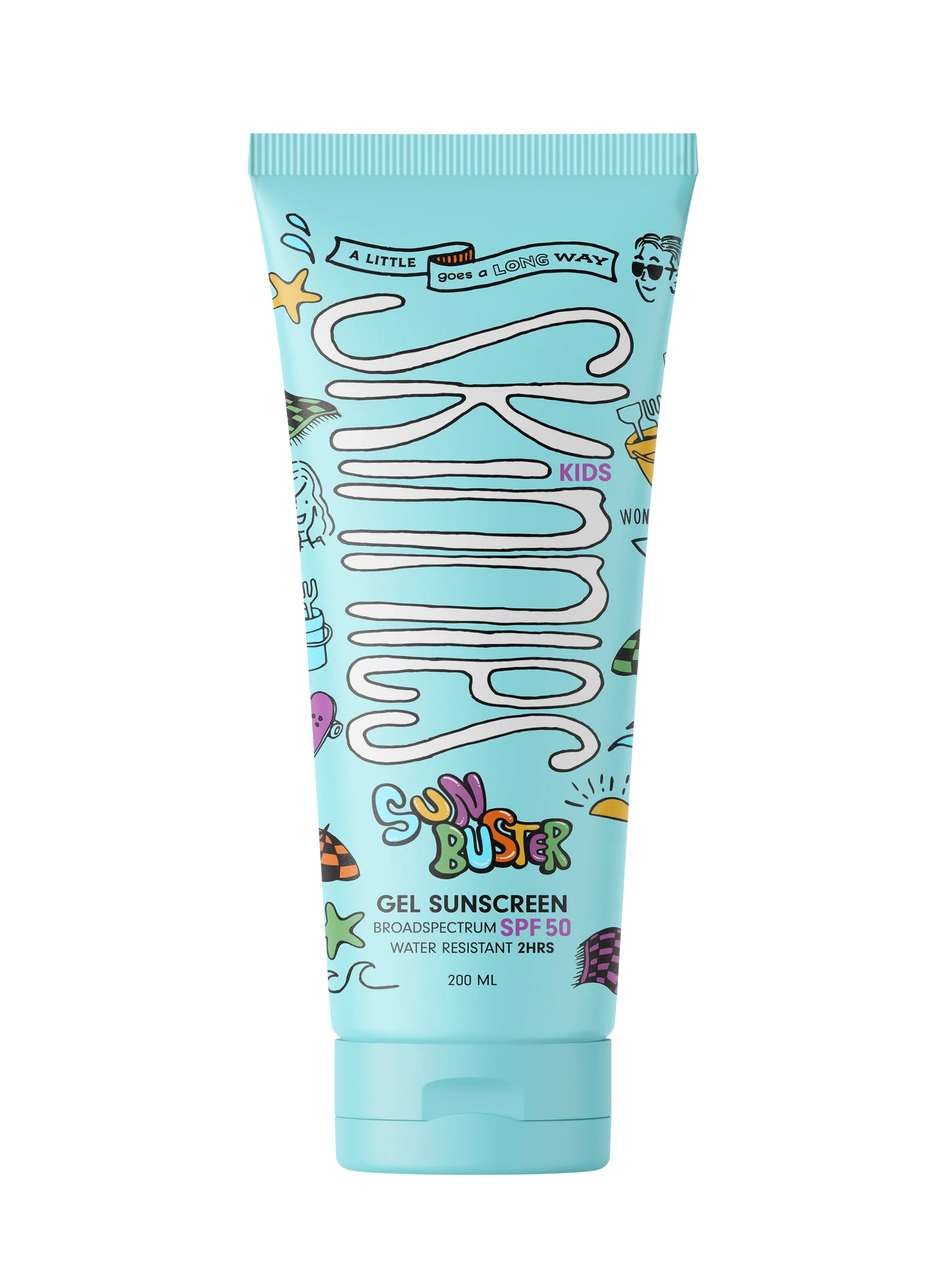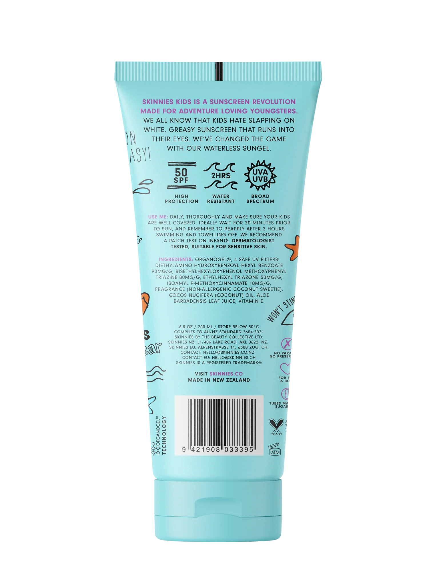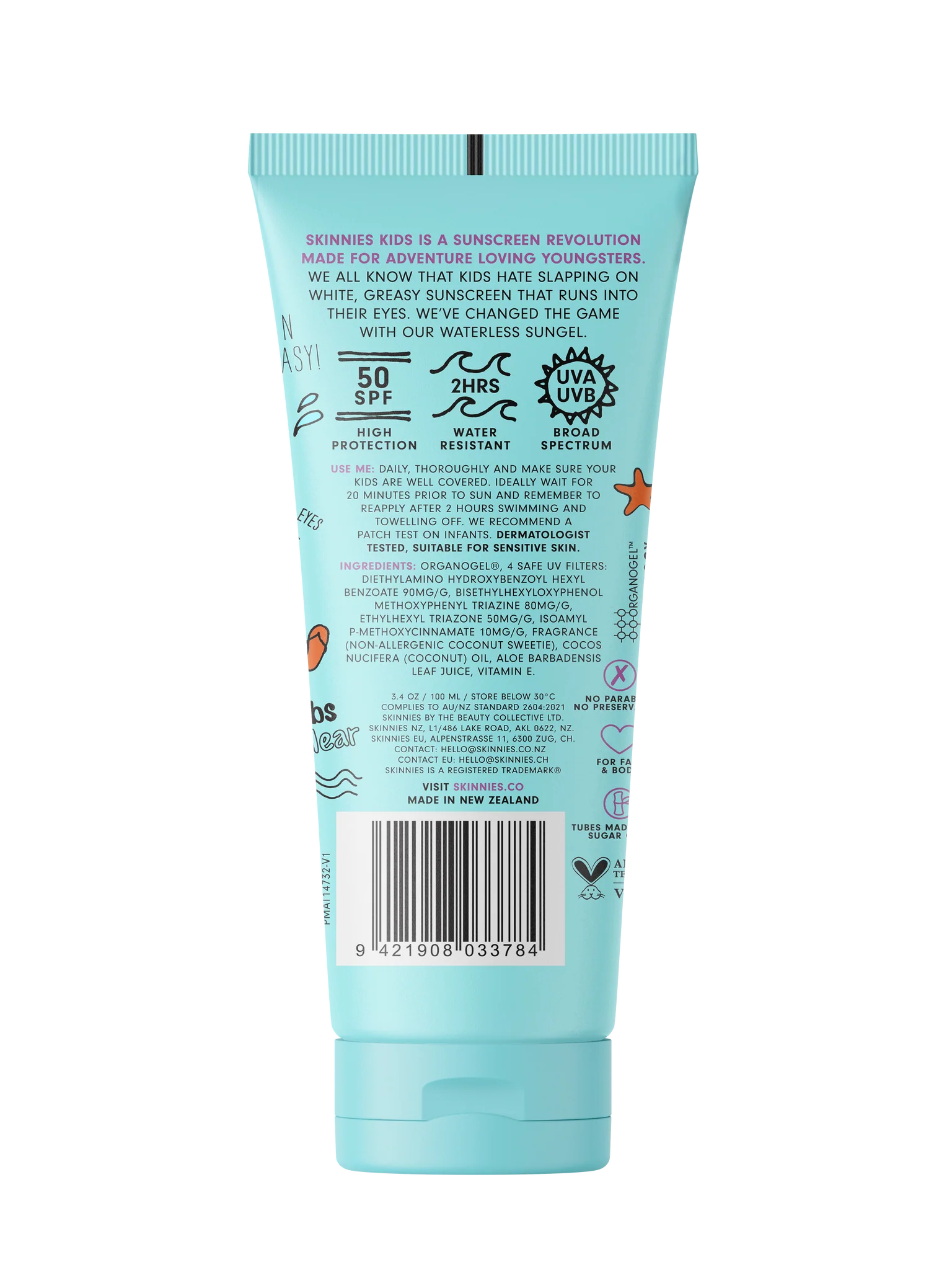 Designed for active kids, Skinnies soft, honey coloured sun gel is suitable from 3 months old. Added coconut oil & aloe extract for soothing skin and a yummy coconut scent. Perfect for busy parents - put Skinnies on and know your kids will be protected for longer.