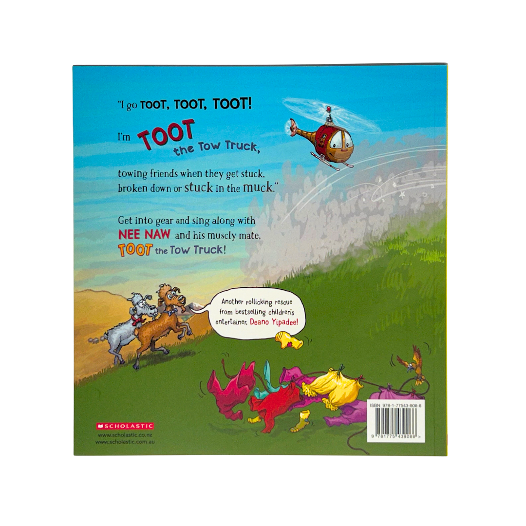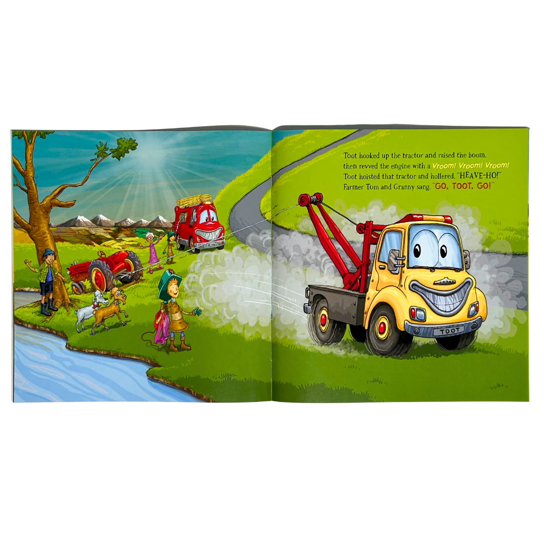 Those goats of Granny’s have been joy-riding on Farmer Tom’s tractor and have got themselves in a bit of a pickle, with the tractor stuck in a pond, and themselves up a tree! Nee Naw quickly appraises the situation – he can rescue the goats and he calls upon his friend Toot to come and pull out the tractor.